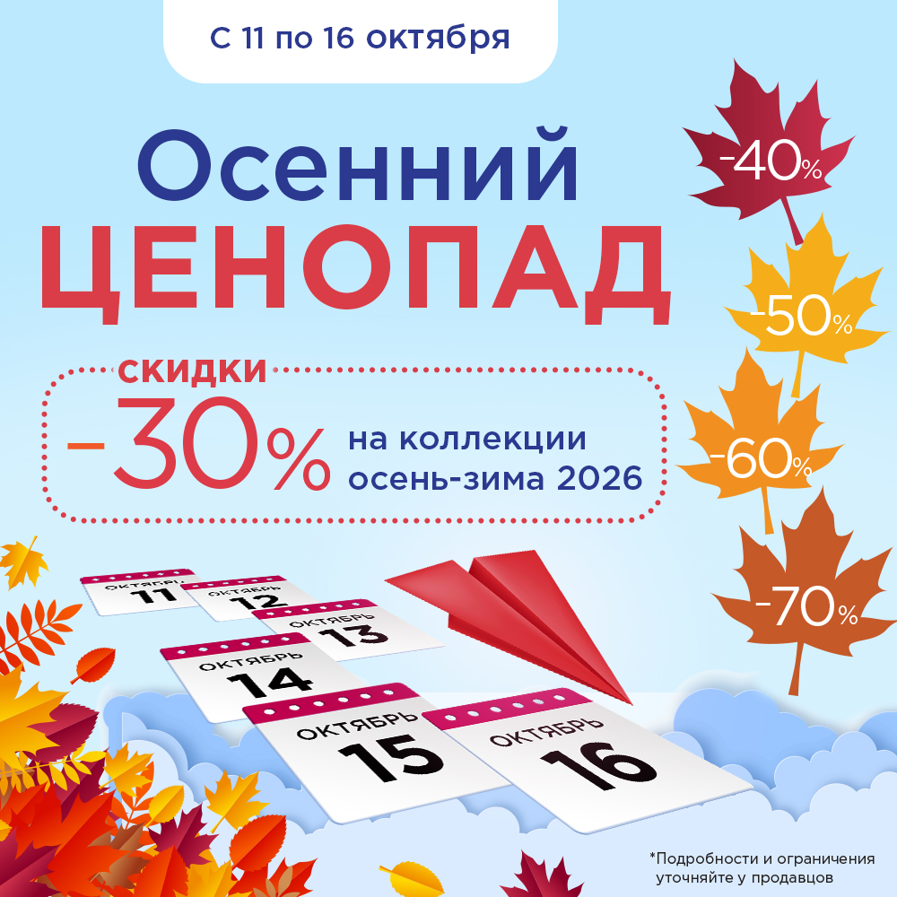 ← Назад Осенний ценопад! 10 октября, 2025 С 11 по 16 октября погрузитесь в «Осенний ценопад» и обновите гардероб со скидкой -30%. Встречайте холода с безупречным вкусом и выгодой.