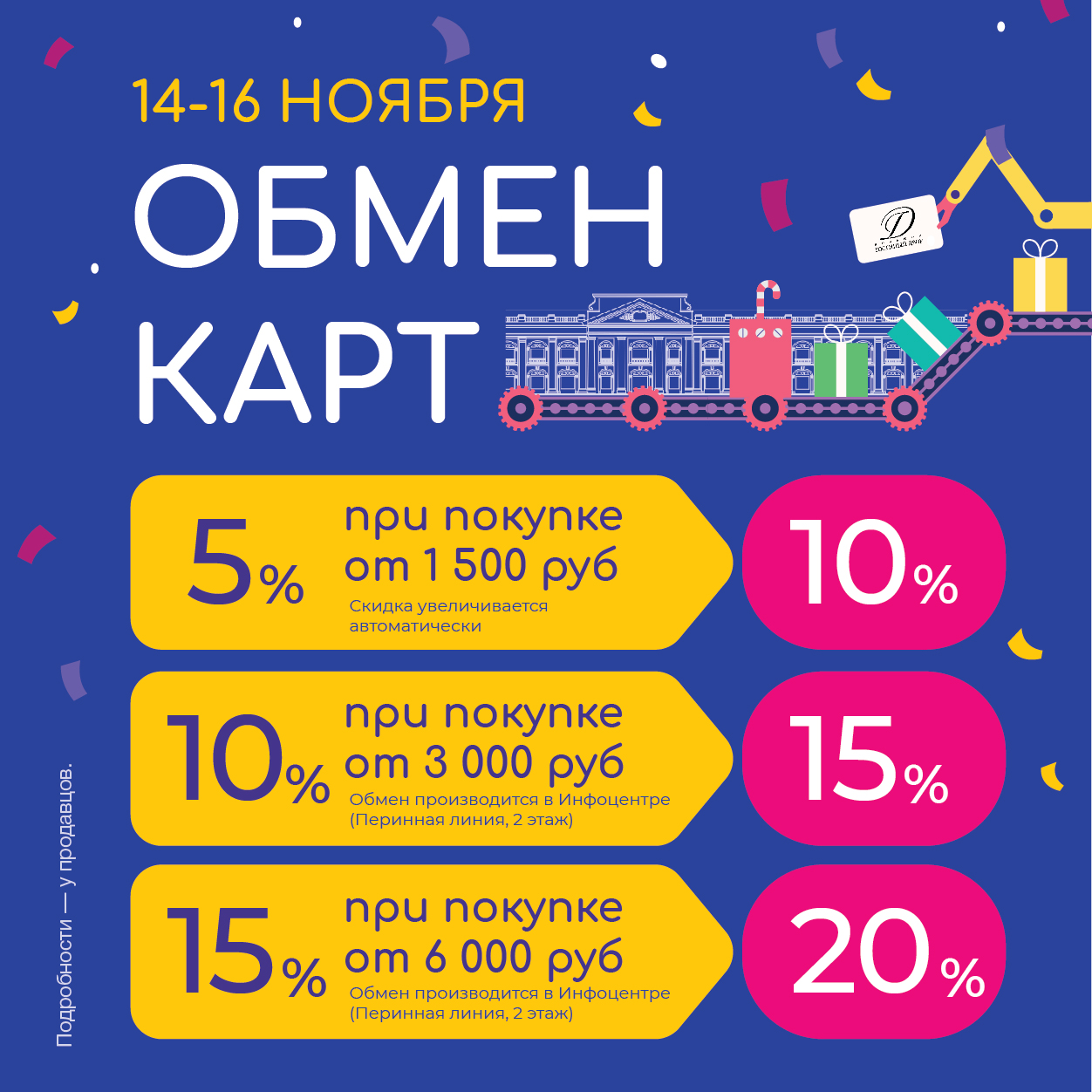 ← Назад Обмен карт! 14 ноября, 2025 С 14 по 16 ноября - Обмен карт!Повышаем уровни выгоды: 5% на 10%, 10% на 15%, 15% на 20%!!!Совершайте покупки - получайте больше скидок! Универмаг Большой Гостиный Двор - с нами выгодно❤️