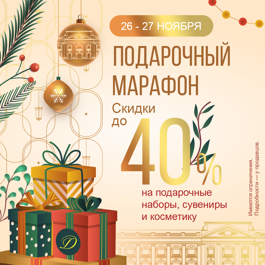 ← Назад Подарочный марафон! 26 ноября, 2025 Время чудес и подарков начинается! 26 и 27 ноября — Подарочный марафон.Скидки до 40% на подарочные наборы, сувениры и косметику. Дарите радость красиво вместе с Большим Гостиным Двором💛